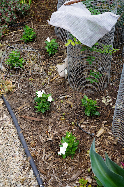 Succession planting:  Dutch Iris cut to the ground for the dry season in the veggie/cutting garden, Catharanthus added for summer flowers: